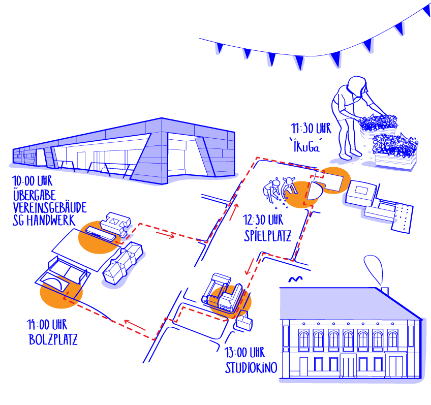Zum Tag der Städtebauförderung ist es Tradition, die aus Fördermitteln hergestellte Bauprojekte der Öffentlichkeit vorzustellen. Zum diesjährigen Aktionstag möchte der Fachdienst Stadtplanung und das Stadtteilmanagement Neustadt (Internationaler Bund) die umgesetzten und in Umsetzung befindlichen Projekte im Stadtteil Neue Neustadt im Rahmen einer Stadtteiltour präsentieren. Beginn und Ausgangspunkt für die geführte Tour bildet die offizielle Übergabe und Eröffnung des Vereinsgebäudes der SG Handwerk, an der auch die Oberbürgermeisterin Simone Borris teilnehmen wird. Die anschließende Stadtteiltour führt über den Interkulturellen Garten „IkuGa“ (Haldensleber Str. 6) zum neuen Spielplatz „Reise um die Welt“ in der Wedringer Straße. Von hier aus geht es weiter zur Baustelle des Studiokinos (Moritzplatz 1a). Hier gibt es neben einer Führung zum aktuellen Baufortschritt eine kleine Baustellenparty mit der Möglichkeit auf eine kleine Stärkung und Erfrischung. Den Abschluss der Stadtteiltour bildet der Bolzplatz und die in Planung befindliche Freifläche (Siedlerweg) neben dem Vereinsgelände der SG Handwerk.